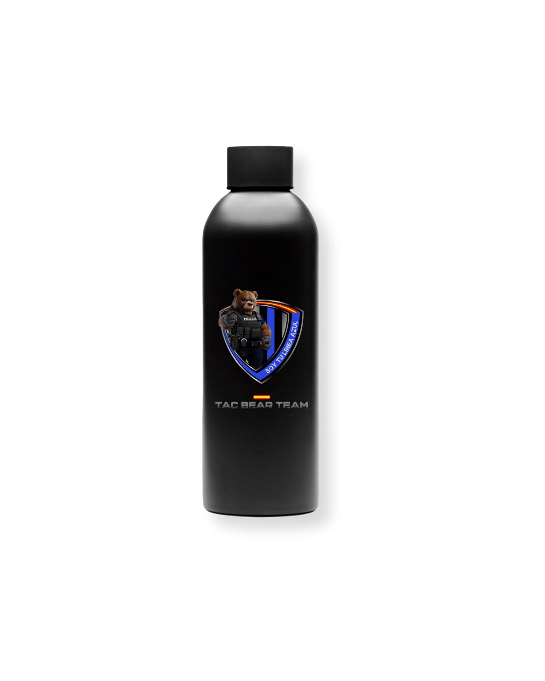 Botella reutilizable TAC Bear Team en color negro mate, con diseño policial del emblemático oso y escudo “Soy tu línea azul”. Resistente, ligera y perfecta para entrenamientos, trabajo o uso diario.